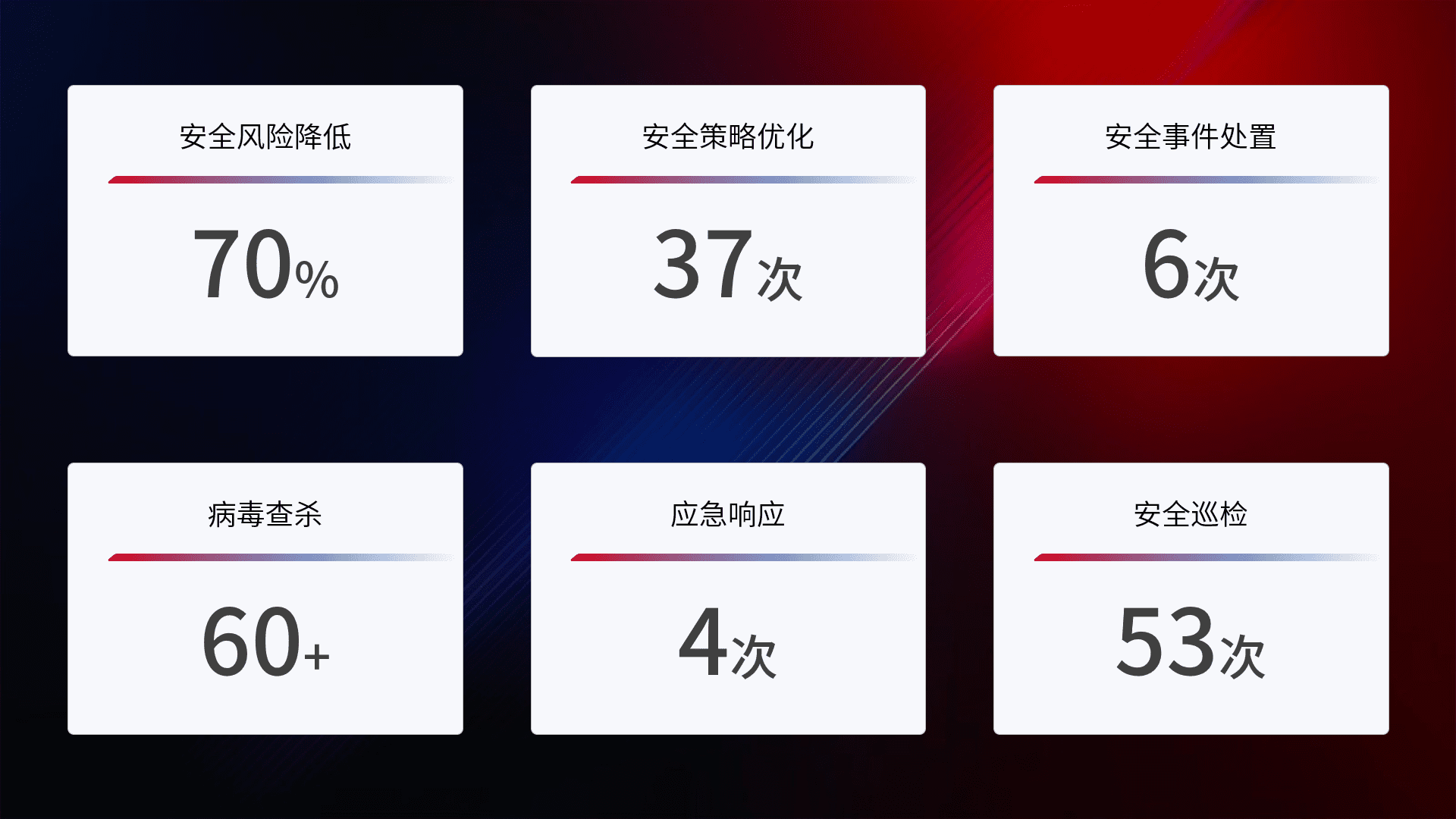 综合报告与文档服务: 定期提供安全事件处置报告、、、周/季度总结报告和年度总结报告;详尽的文档服务可帮助客户了解网络安全状况,,支持决策制定和流程优化。。。。