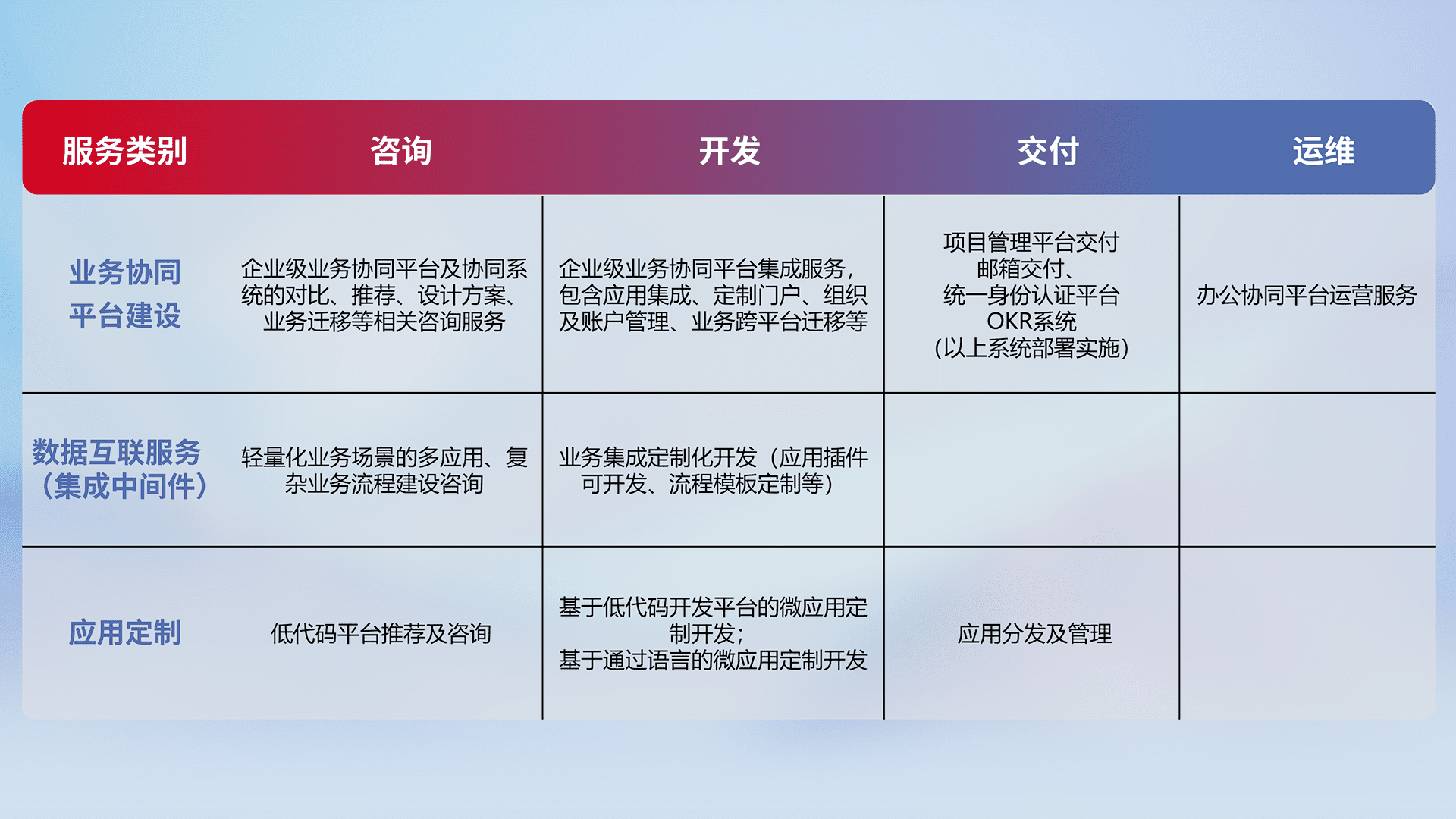 针对钉钉、、企微、、、IDaas等平台级产品提供产品的规划、、、、方案、、交付、、、定制化开发等服务,,实现如统一协同办公、、智能客户服务、、、、混合会议管理、、、、智能数据查询、、、等业务场景,,实现数字化转型。。